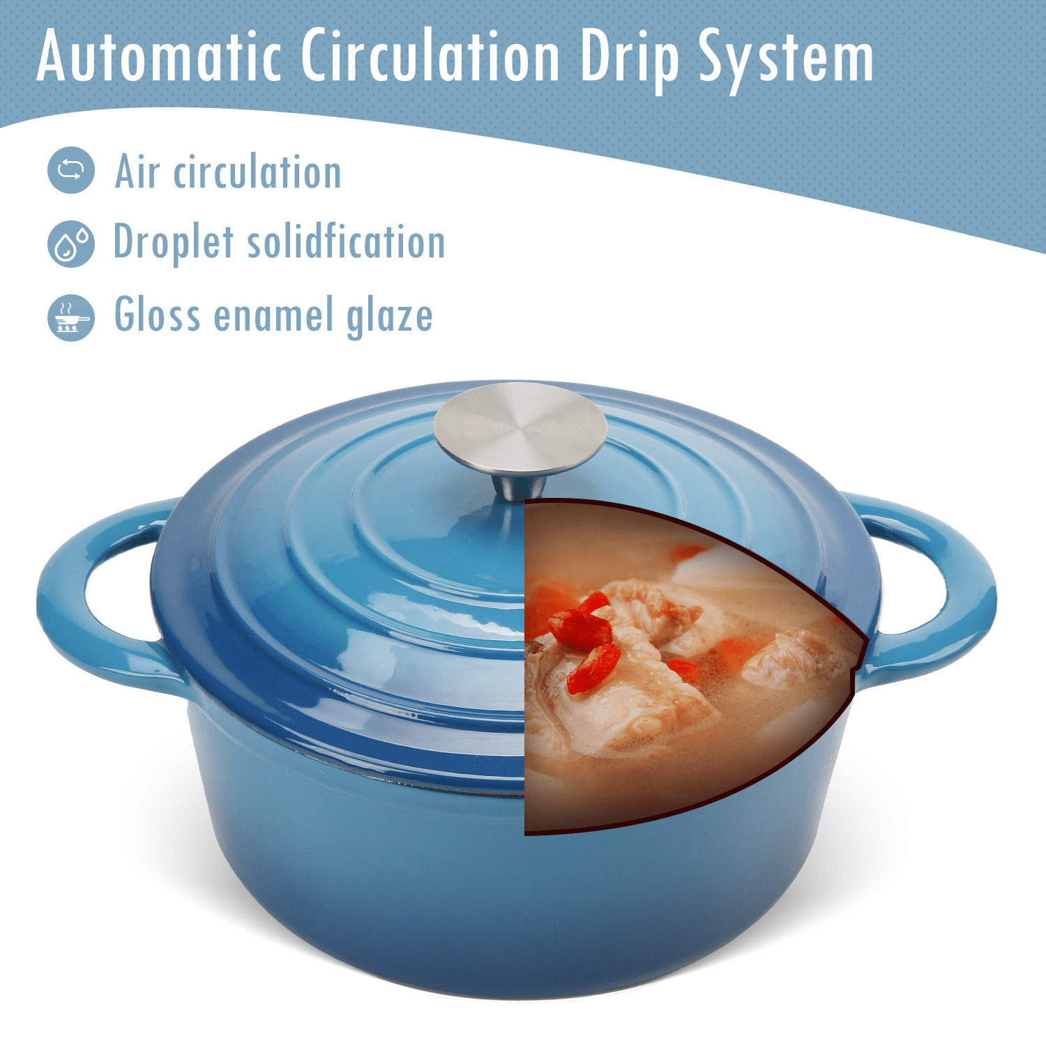 1.Self-circulating Lid -This dutch oven pot is design with circulating shower type lid, designed to catch steam as it rises in the pot & condense the steam back into water inside the lid,evenly fall on the food to maintain the original nutrition.